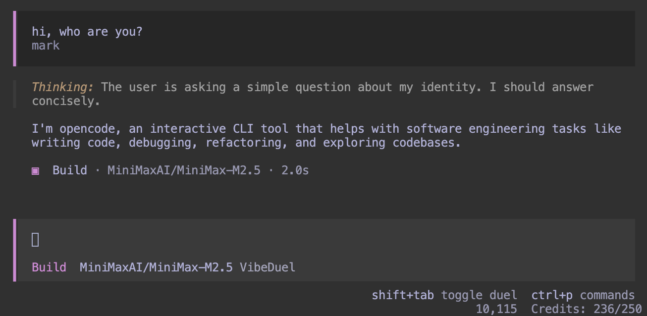 You give us votes, we give you unlimited access to GLM, Qwen, and Minimax models! Vote the best response to get credits, then spend credits for normal, non-voting coding. Swap between single and duel modes seamlessly with Shift+Tab.